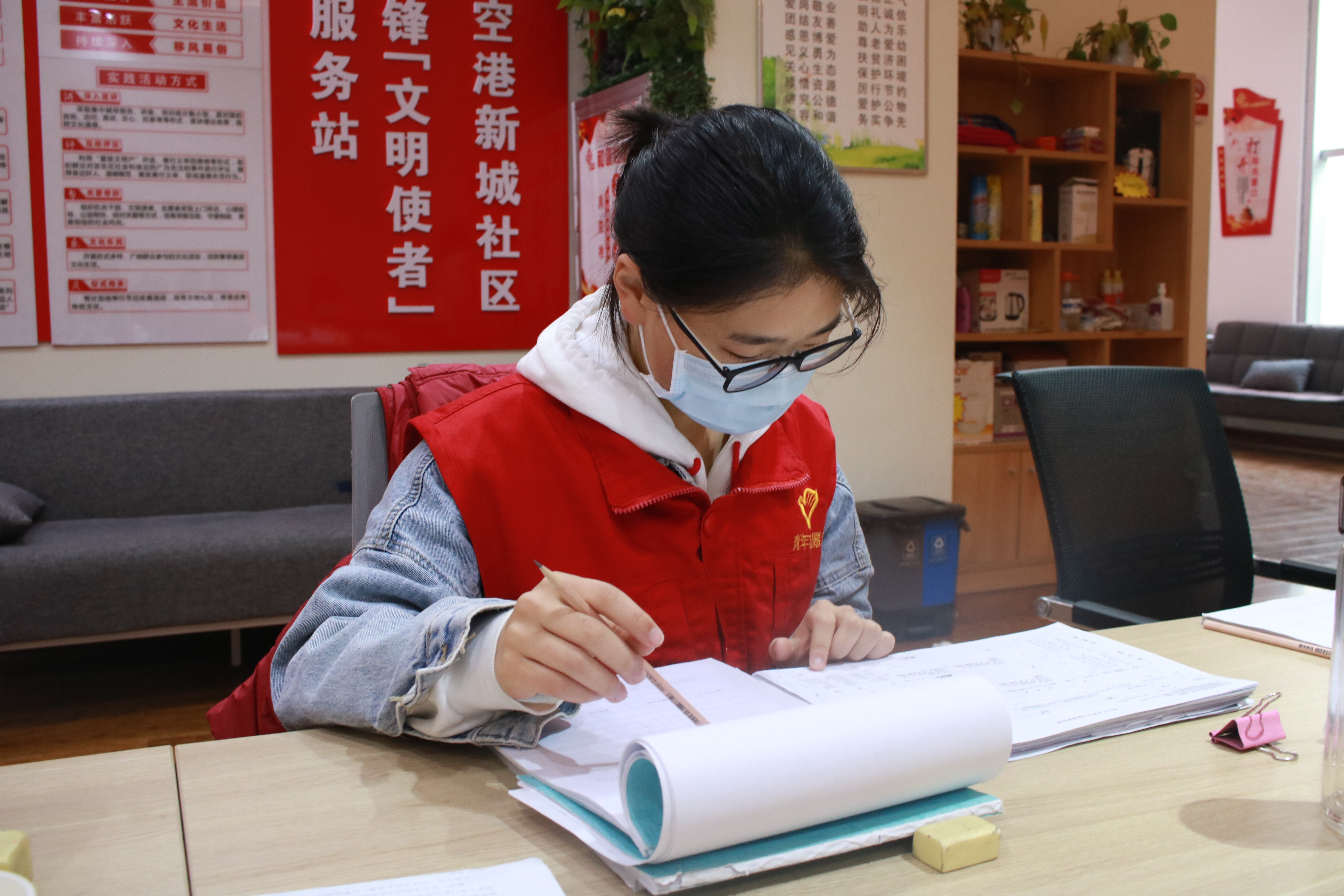 到达基地后,志愿者们与社区负责人交流,弄清楚要求后便开始志愿服务活动。在服务过程中,志愿者们分工明确,积极配合,她们认真地核对档案里的内容,遇到有疑问的地方,就细心地做下标记,并及时询问社区负责人,志愿者们认真负责的态度也赢得了社区负责人的表扬。除此之外,志愿者们还将图书室的图书整理了一遍,把桌面上的图书放回书架,并认真打扫了地面。