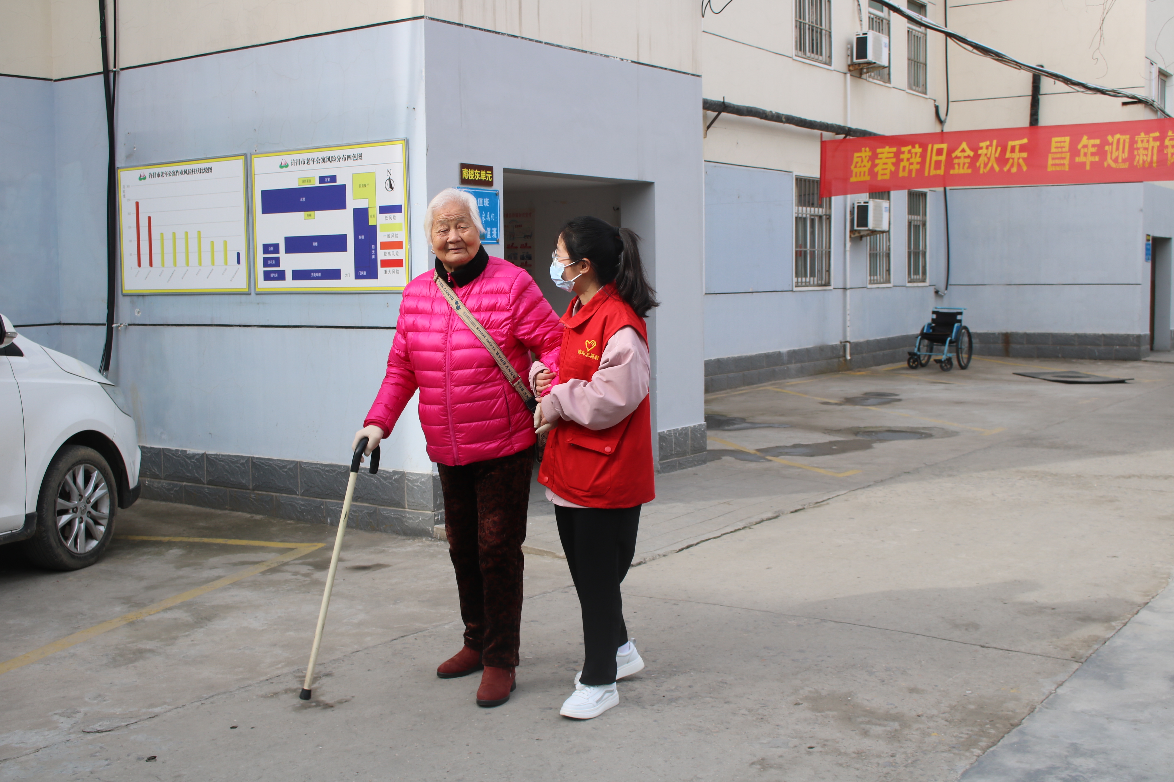 到达基地后,志愿者们便开始了当天的志愿活动。志愿者们来到院子里,他们细心地扫地,擦拭窗户,并将垃圾分类好后扔到垃圾箱里。打扫完卫生后,志愿者们便扶着老人们一起到院子里晒太阳、聊天。志愿者们一边为老人捏肩,一边讲着故事,有的志愿者帮厨房择菜,还有的志愿者陪老人下棋,老人们和志愿者们相处融洽,笑声不断。在大家欢笑笑语的同时,一位志愿者发现一位年过八旬的老奶奶行动不便,志愿者们便来到老人身边,为奶奶推车,陪老奶奶在院子里看花,听着奶奶讲述她年轻时的故事,志愿者们积极地与奶奶互动,看着奶奶灿烂的笑容,志愿者们心里也暖暖的。